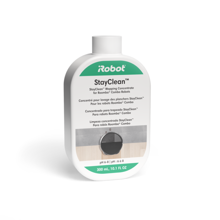 A StayClean™ Mopp koncentrátum, vízzel keverhető egy speciálisan a Roomba® Plus 405, Plus 505 és Max 705 Combo robotokhoz kifejlesztett tisztítószer. A legtöbb kemény padlón, beleértve a lakkozott keményfa padlókat is, biztonságosan használható, és a felmosás során tartós, friss illatot kölcsönöz a helyiségnek.