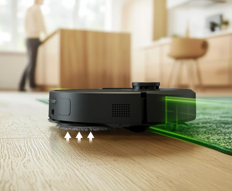 Amikor a robot szőnyeget érzékel, automatikusan megemeli a felmosó párnákat, így egyszerre képes a szőnyegeket porszívózni és a kemény padlókat felmosni.